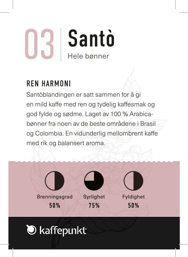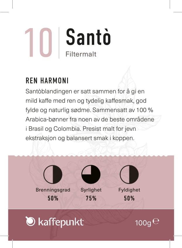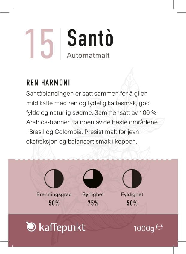 Santòblandingen er satt sammen for å gi en mild kaffe med ren og tydelig kaffesmak, god fylde og naturlig sødme. Sammensatt av 100 % Arabica-bønner fra noen av de beste områdene i Brasil og Colombia. Presist malt for jevn ekstraksjon og balansert smak i koppen.