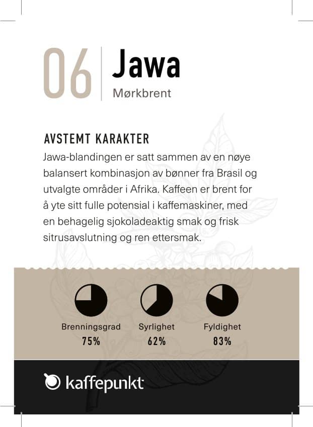 Jawa-blandingen er satt sammen av en nøye balansert kombinasjon av bønner fra Brasil og utvalgte områder i Afrika. Kaffeen er brent for å yte sitt fulle potensial i kaffemaskiner, med en behagelig sjokoladeaktig smak og frisk sitrusavslutning og ren ettersmak.