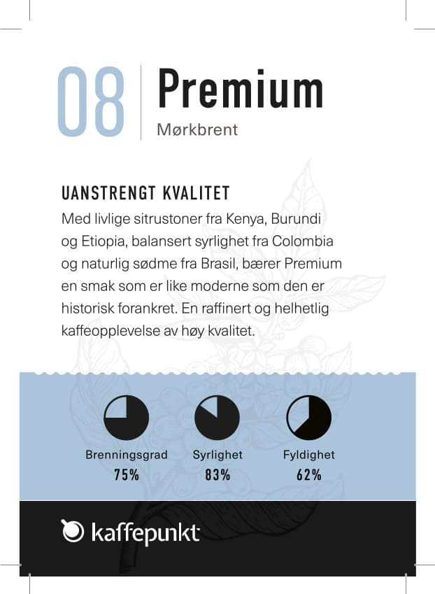 Med livlige sitrustoner fra Kenya, Burundi og Etiopia, balansert syrlighet fra Colombia og naturlig sødme fra Brasil, bærer Premium en smak som er like moderne som den er historisk forankret. En raffinert og helhetlig kaffeopplevelse av høy kvalitet.